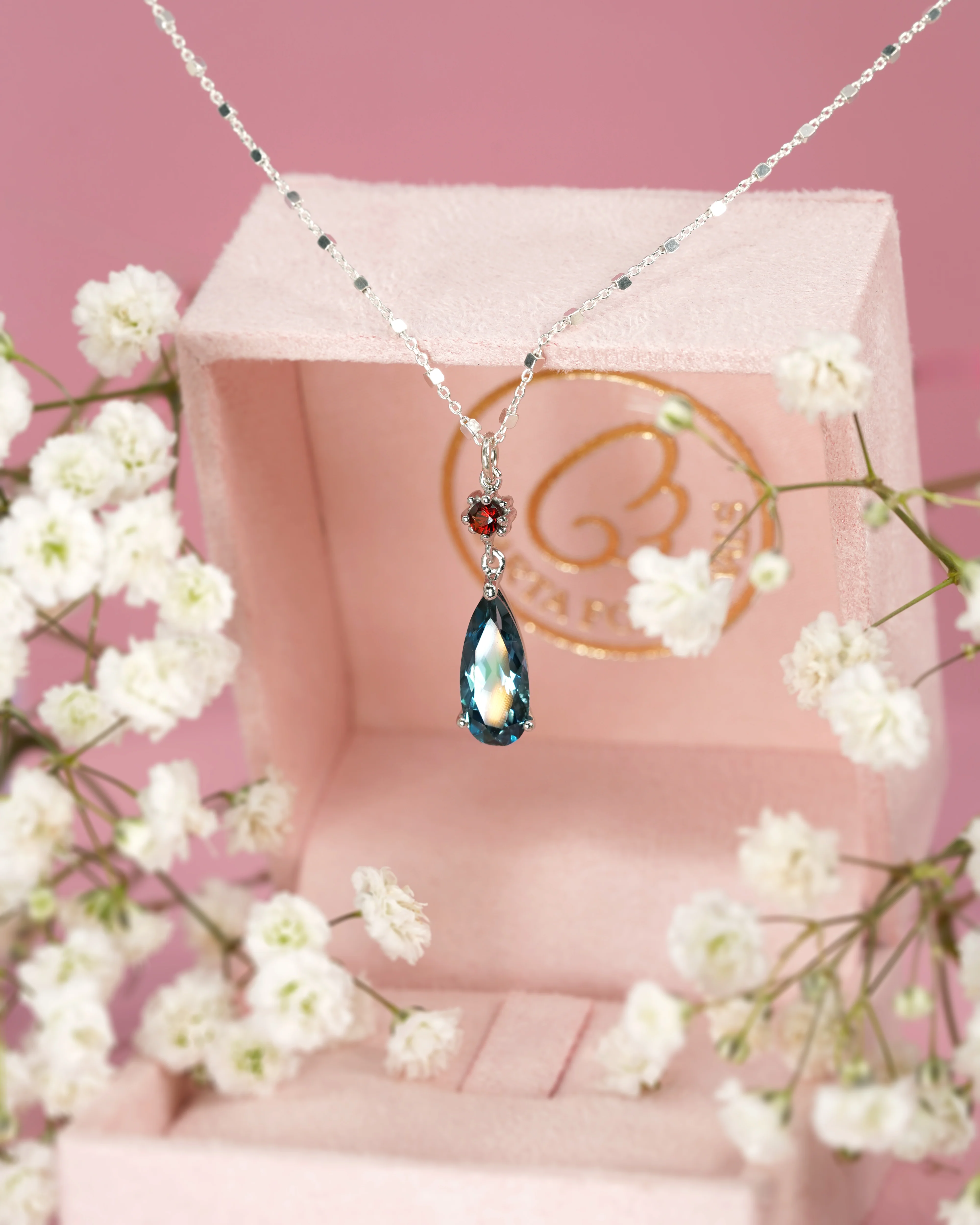 • Natural Garnet 3mm & Natural London blue topaz 14x6mm