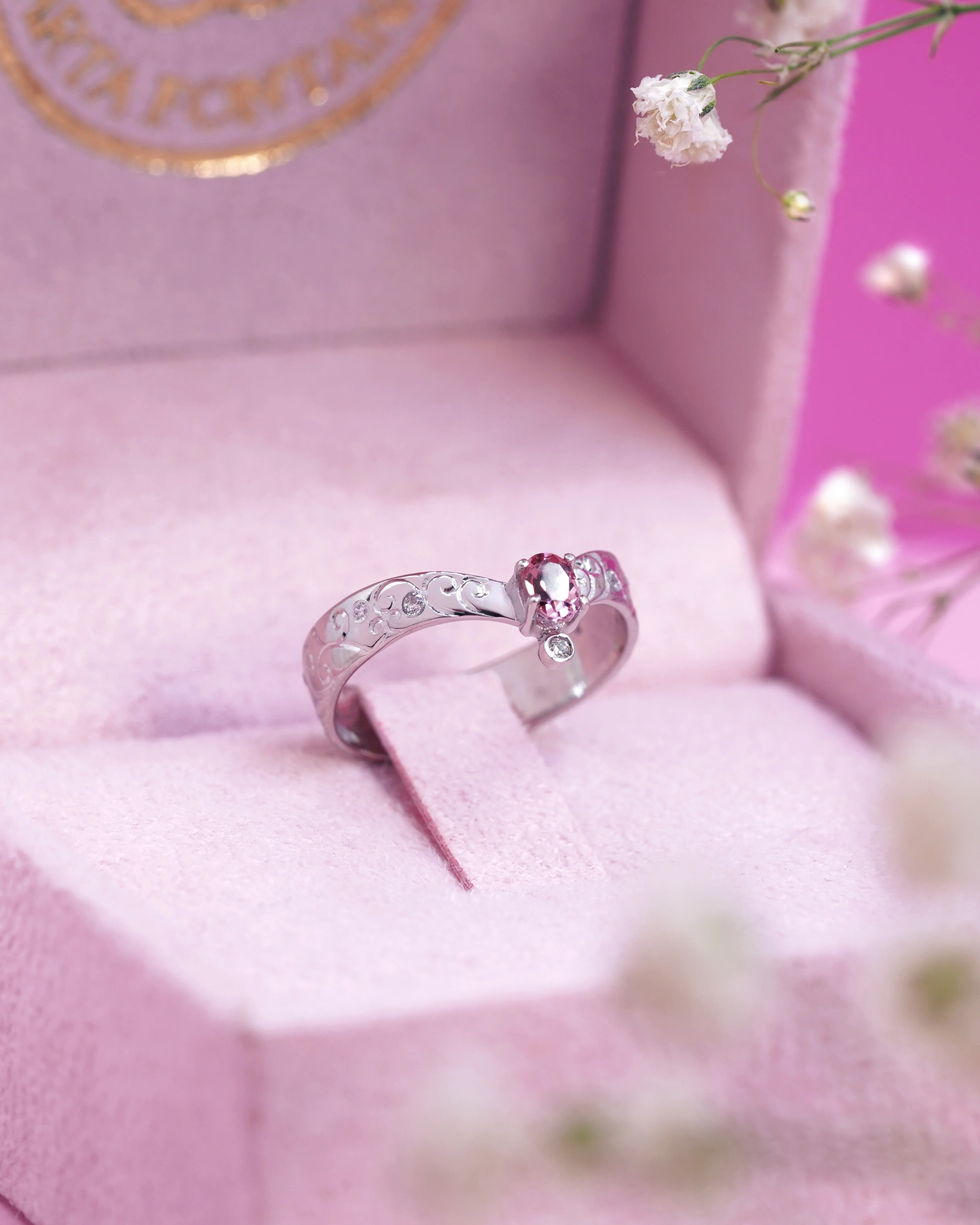 Valentina is a declaration of tenderness. The delicate floral engravings that decorate the band turn this piece into a dream-like jewel, as if you were wearing a story carved in silver around your finger. It whispers love, elegance, and softness in every detail.