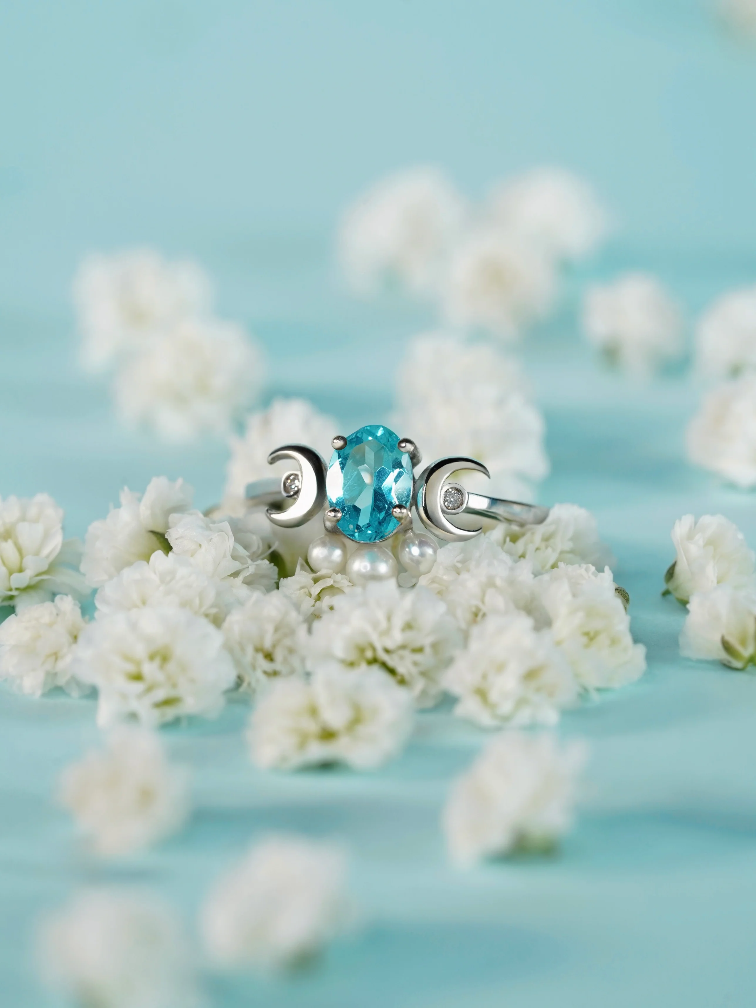 The Lunara Ring is a celestial piece inspired by the harmony of the moon and the sea. The luminous apatite symbolizes clarity and dreams, while the pearls evoke elegance and the natural diamonds in the moons reflect eternal light.